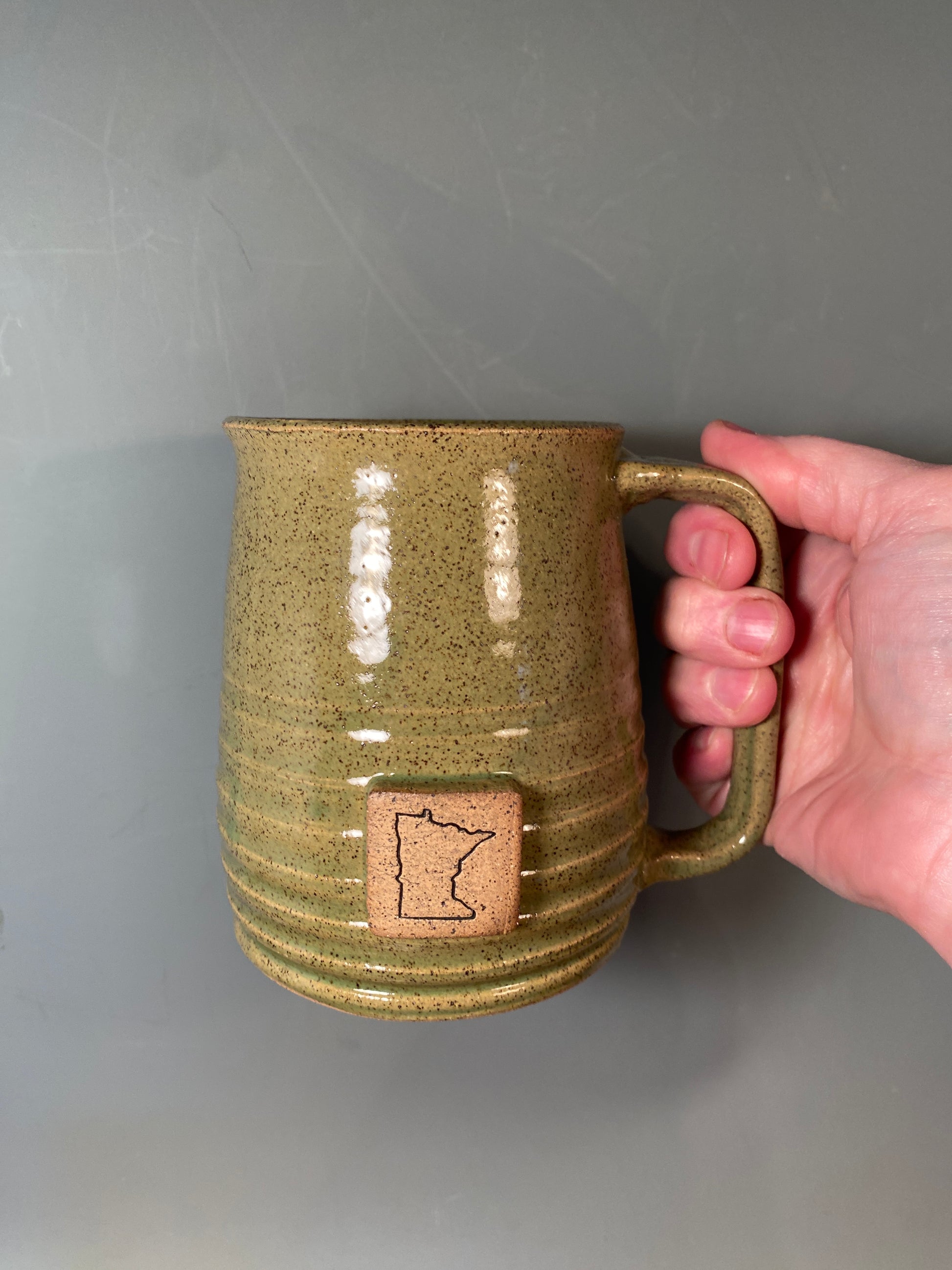 This is a wheel thrown large 16 oz coffee mug to be personalized with your choice of accent stamp in your choice of color. Graceful curvy sides with groovy texture and a raised stamped medallion made with a flared lip for your drinking comfort. Comfortable curved handle with hand stamped picture accented in black.