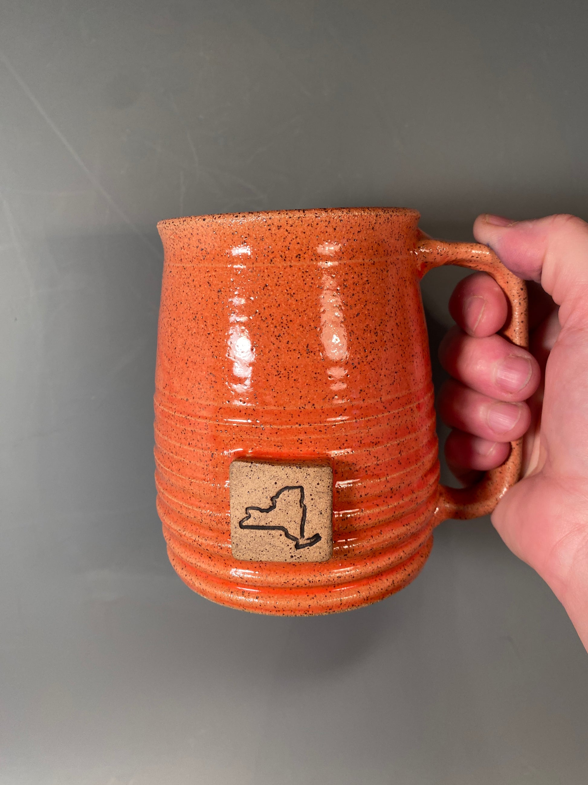 This is a wheel thrown large 16 oz coffee mug to be personalized with your choice of accent stamp in your choice of color. Graceful curvy sides with groovy texture and a raised stamped medallion made with a flared lip for your drinking comfort. Comfortable curved handle with hand stamped picture accented in black.
