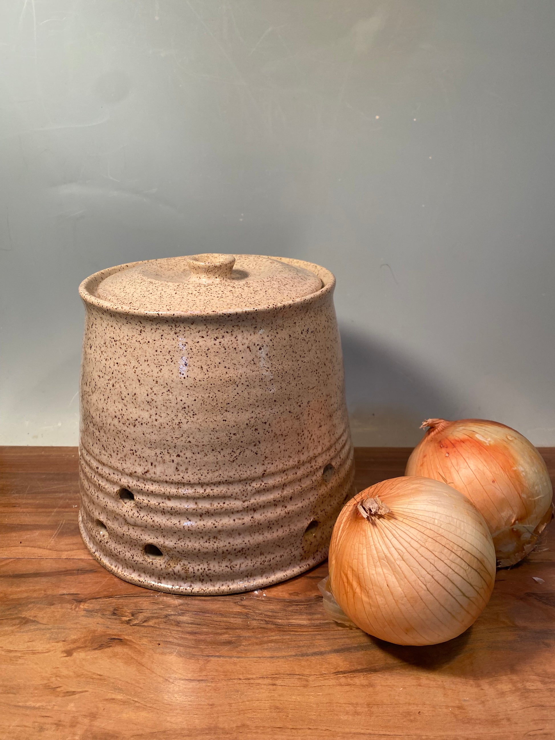 This is a wheel thrown jar made of brown stoneware clay. This Item is made to order. Please allow up to 5 weeks to ship. Made with ventilation holes for root crop storage.