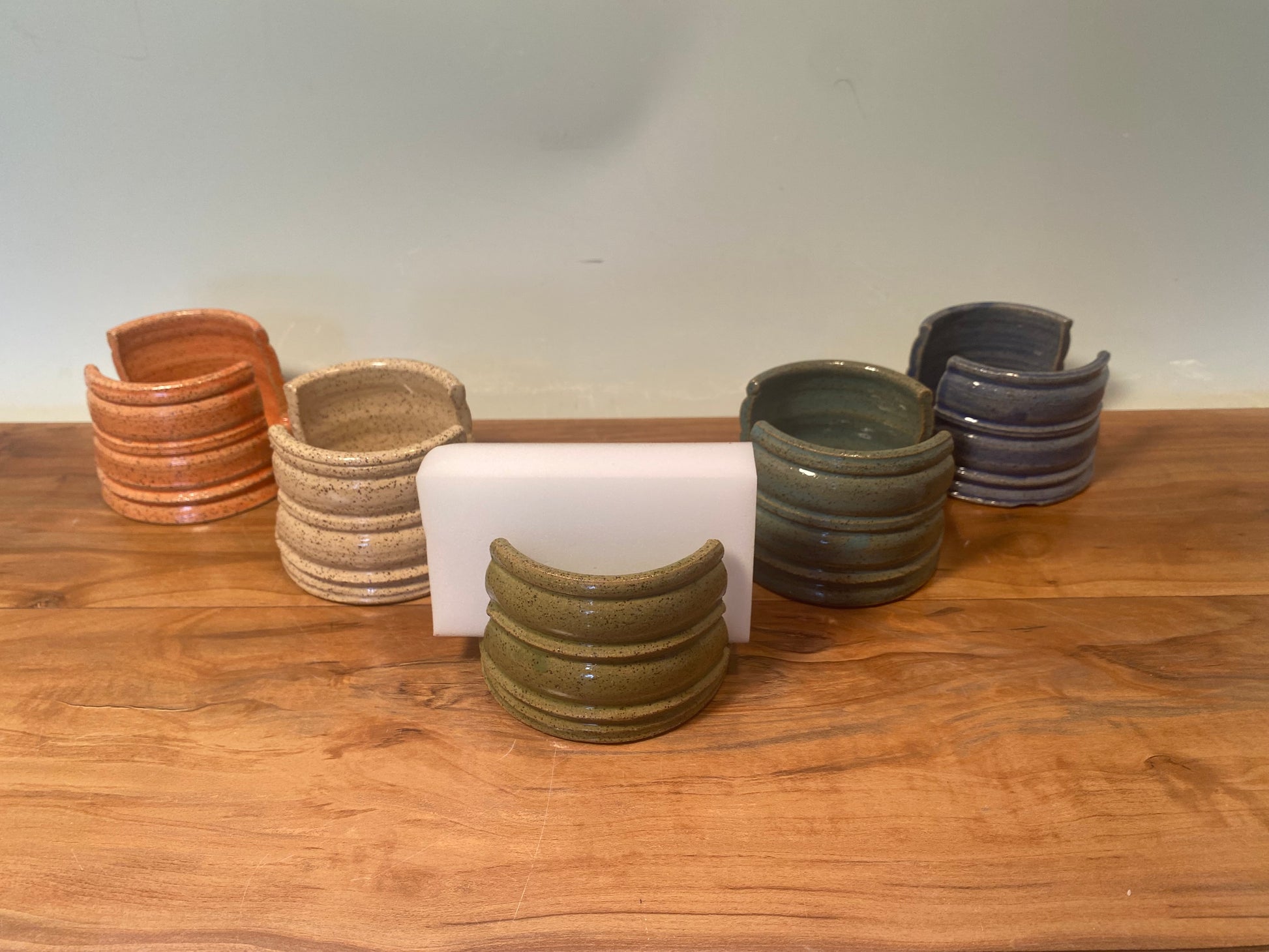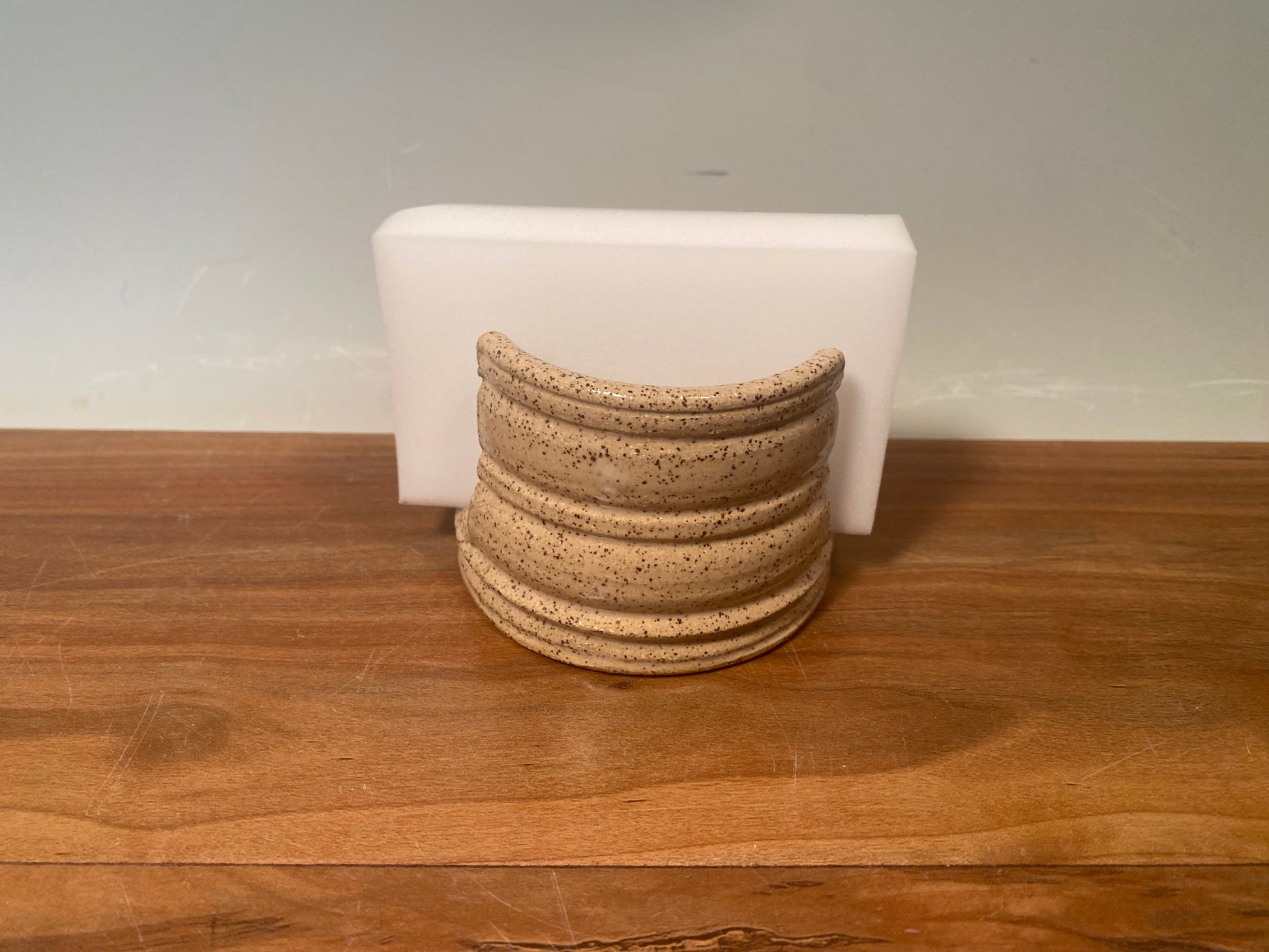 This is a wheel thrown ceramic sponge holder made of brown stoneware clay. Neatly holds your kitchen or bathroom sponge to dry nicely for its next use. Large enough to hold and extra large sponge or a couple of smaller ones!